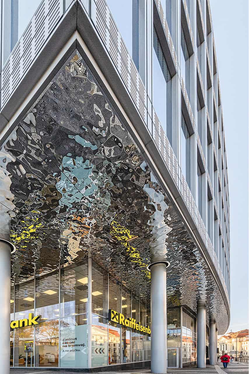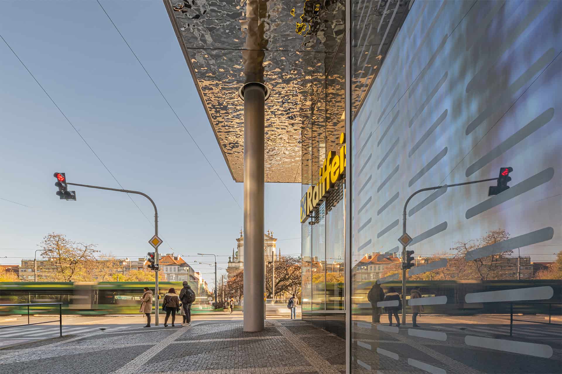 One of the most striking design elements is the highly polished, “wrinkled” ceiling, which reflects the urban space and life below. This textured ceiling creates an interesting design feature that immediately catches people’s attention as they exit the subway and draws them into the new shopping center.