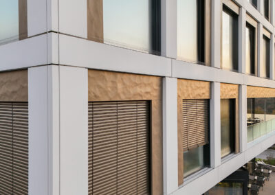 Eine faltige Optik, die das Bügeln nicht vermisst. Edelstahloberflächen erinnern dabei eher an Alufolie, weiß beschichtet wirkt das Paneel wie zerknülltes Papier. Dazwischen bleibt viel Spielraum mit Eloxaltönen und anderen Pulverbeschichtungen.